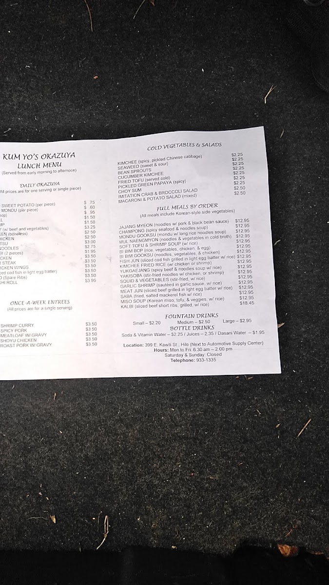 At Kum Yo's Okazuya, you’re in for a treat with a menu that brings a delicious blend of flavors straight to your table. Whether you're craving traditional Hawaiian fare or something with a unique twist, the offerings here are sure to satisfy every taste. The Kum Yo's Okazuya Menu features a variety of dishes, from fresh seafood to perfectly grilled meats, all crafted with the finest ingredients. Every bite is an experience, as the menu combines local flavors with expertly prepared classics, offering something for everyone. The cozy atmosphere at Kum Yo's makes it the perfect spot to enjoy a meal with family and friends, all while indulging in some of the most flavorful food in Hilo.